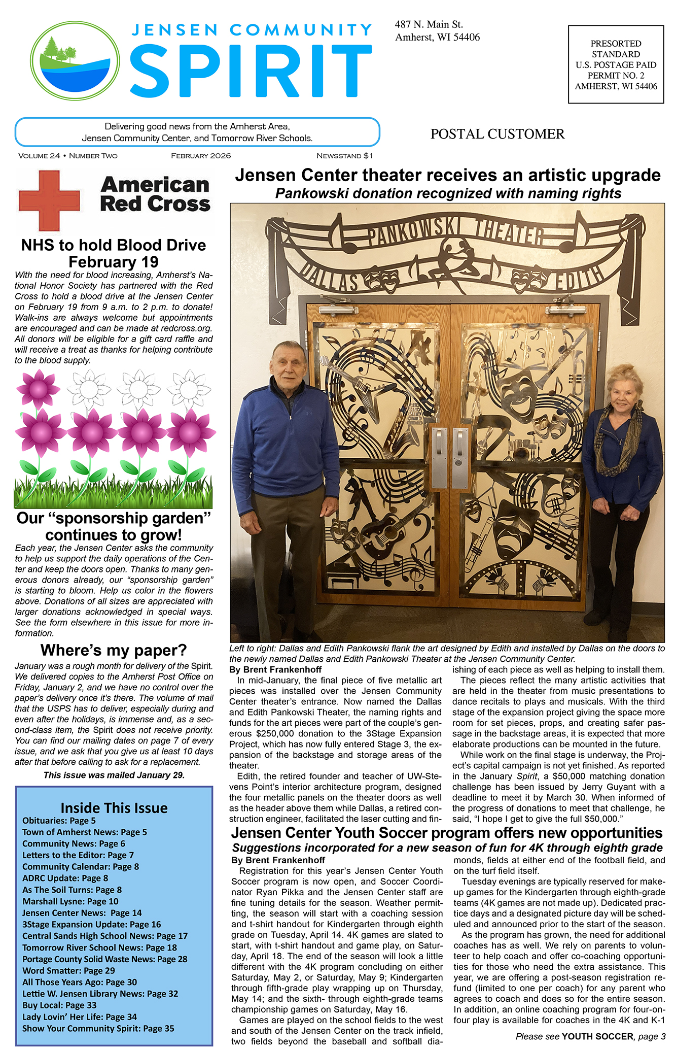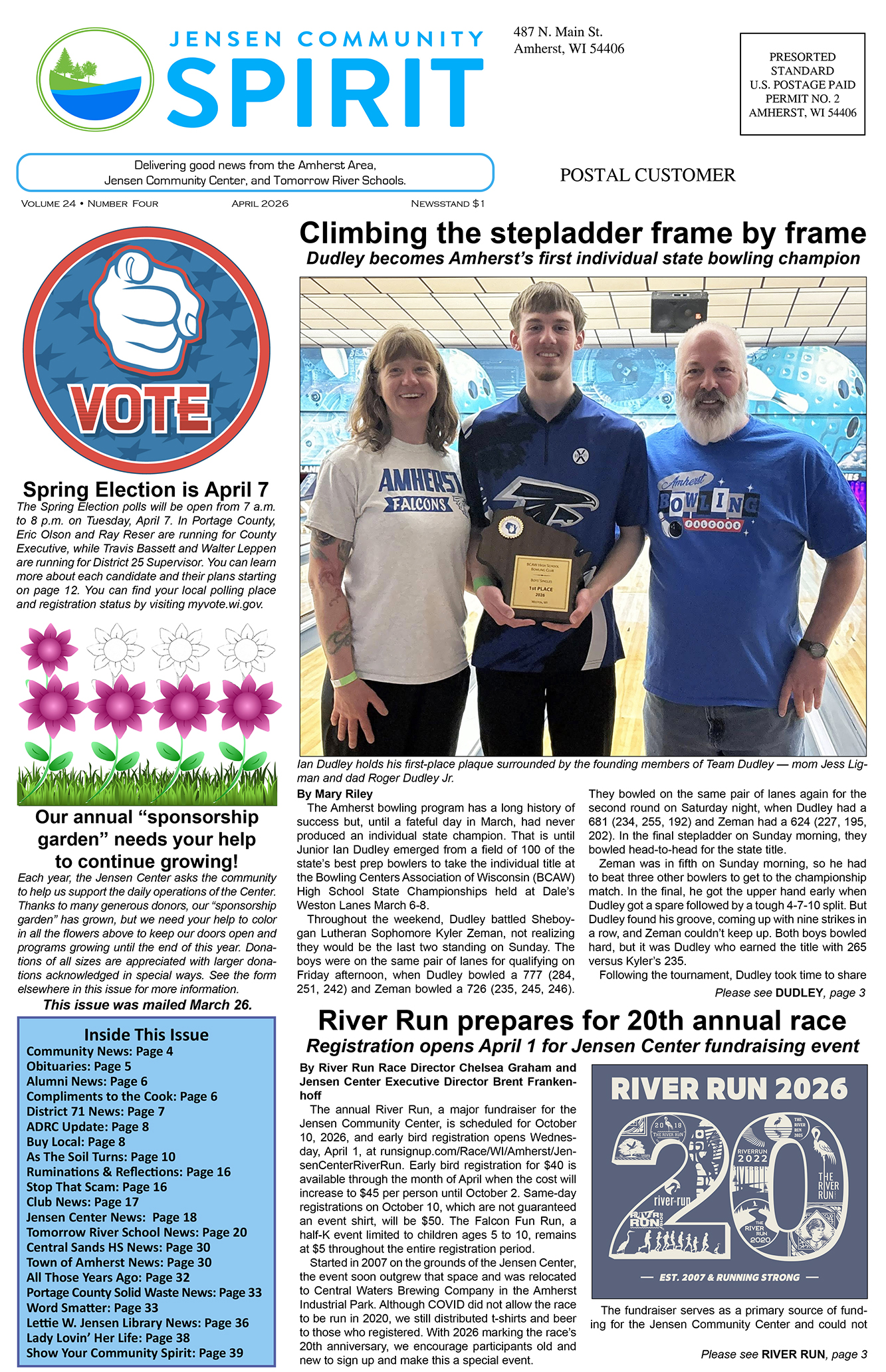 The Jensen Community Spirit is a monthly newspaper bringing good news, events and Amherst school notifications to the Tomorrow River community. The newspaper, with a readership of over 6,000, has been published in the area for over 15 years.