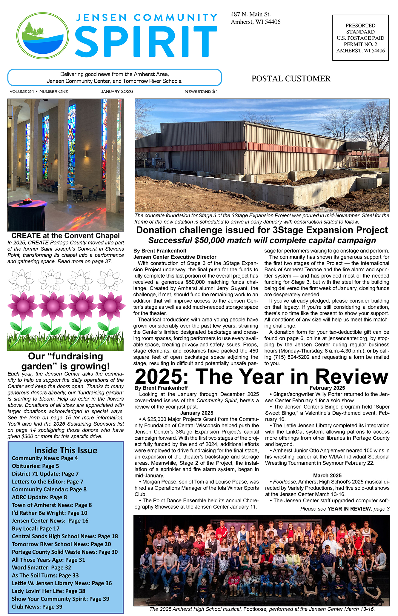 The Jensen Community Spirit is a monthly newspaper bringing good news, events and Amherst school notifications to the Tomorrow River community. The newspaper, with a readership of over 6,000, has been published in the area for over 15 years.