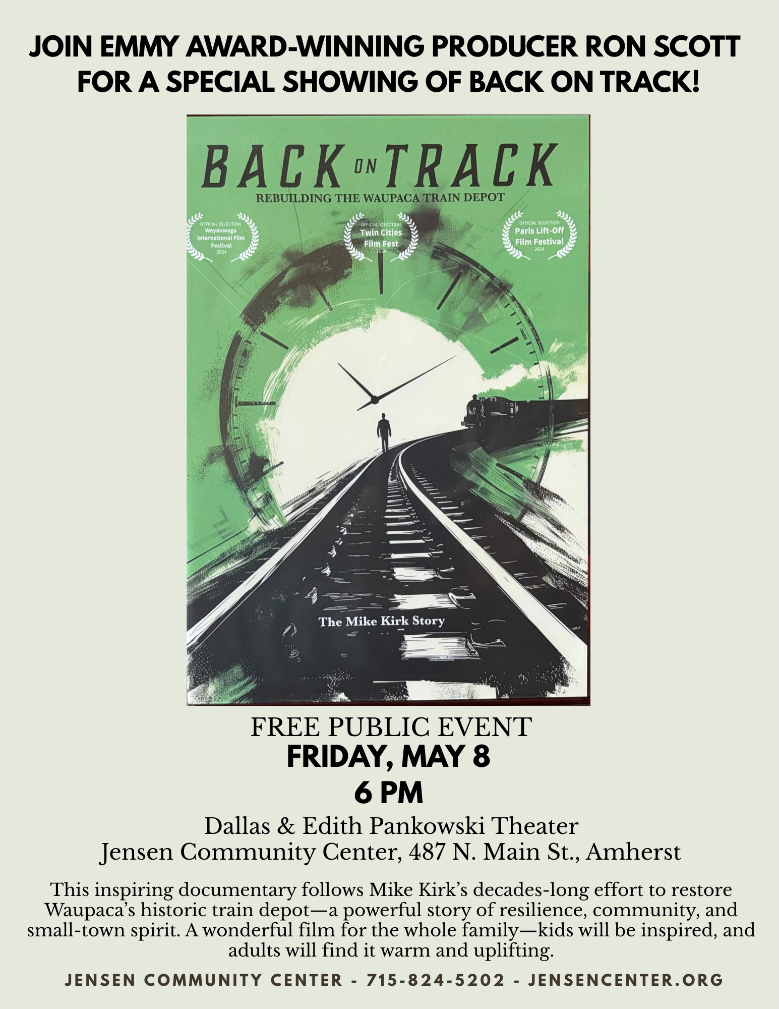 Join Emmy Award-Winning producer, Ron Scott for a special showing of Back on Track, a documentary to restore Waupaca’s historic train depot.  This is a Free Public Event.