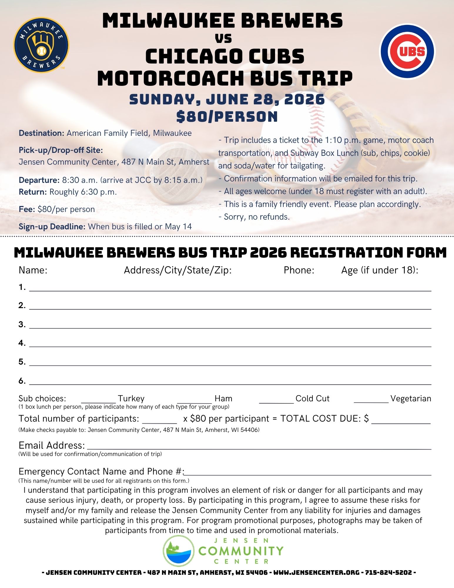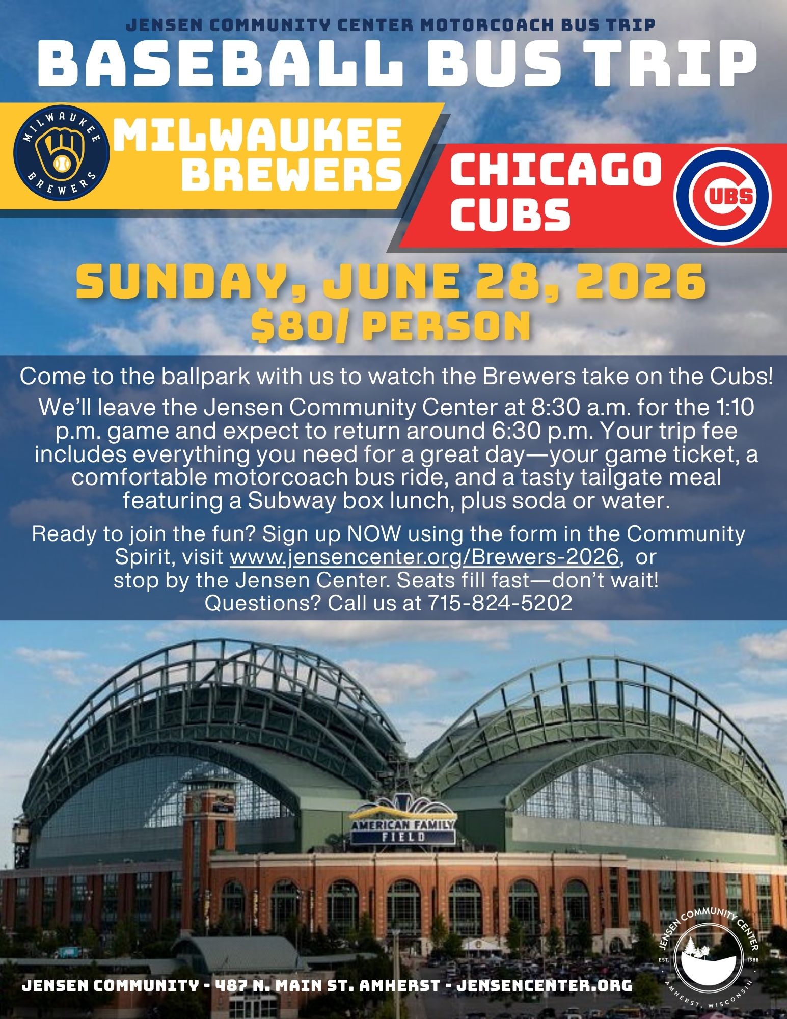 Hop on the bus for a Brewers game against the Chicago Cubs!  Trip includes motor coach bus trip, ticket to the game and Subway subs, chips, & soda/water at tailgating. Join us for the 1:10 pm game!