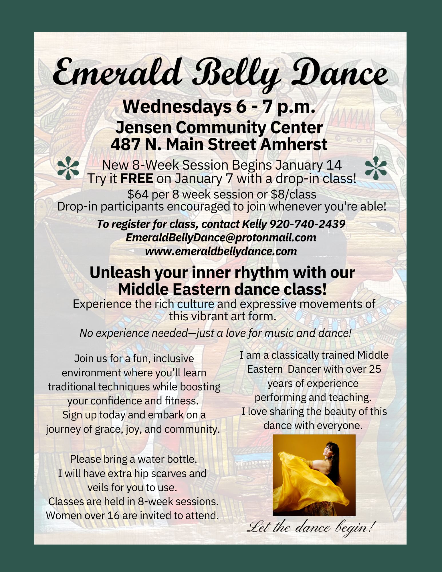 Unleash your inner rhythm with a Middle Eastern dance class!  Join us for a  8 week sessions beginning January 14th. $64 per 8 week or $8/Class, drop ins welcomed. Register for class with Kelly @ 920-740-2439 or email EmeraldBellyDance@protonmail.com