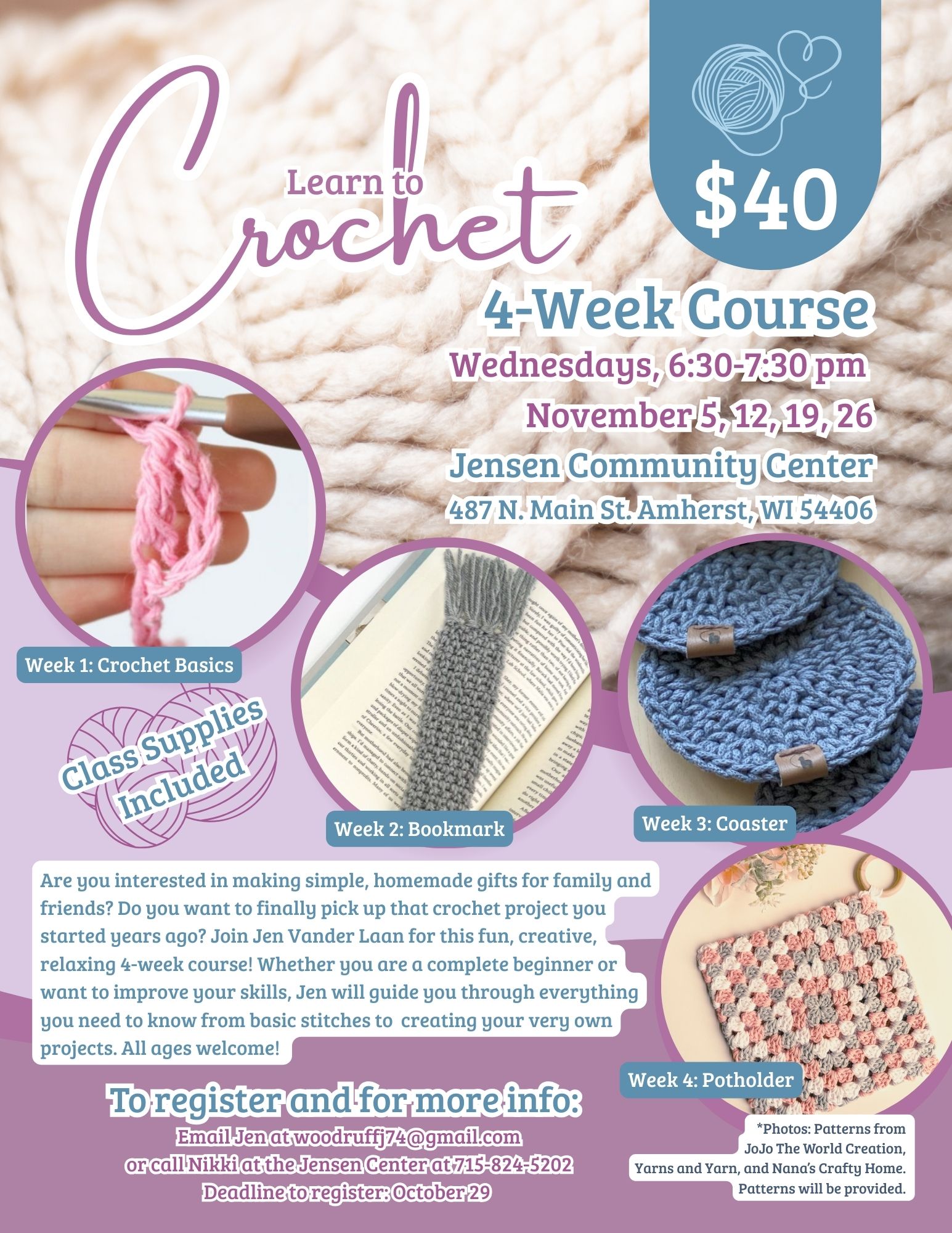 Learn to crochet and make some fun simple items. This 4 week course will guild beginners or improve your skills. Email Jen at woodruffj74@gmail.com or call the Jensen Center to register. Supplies will be included in the $40 fee.