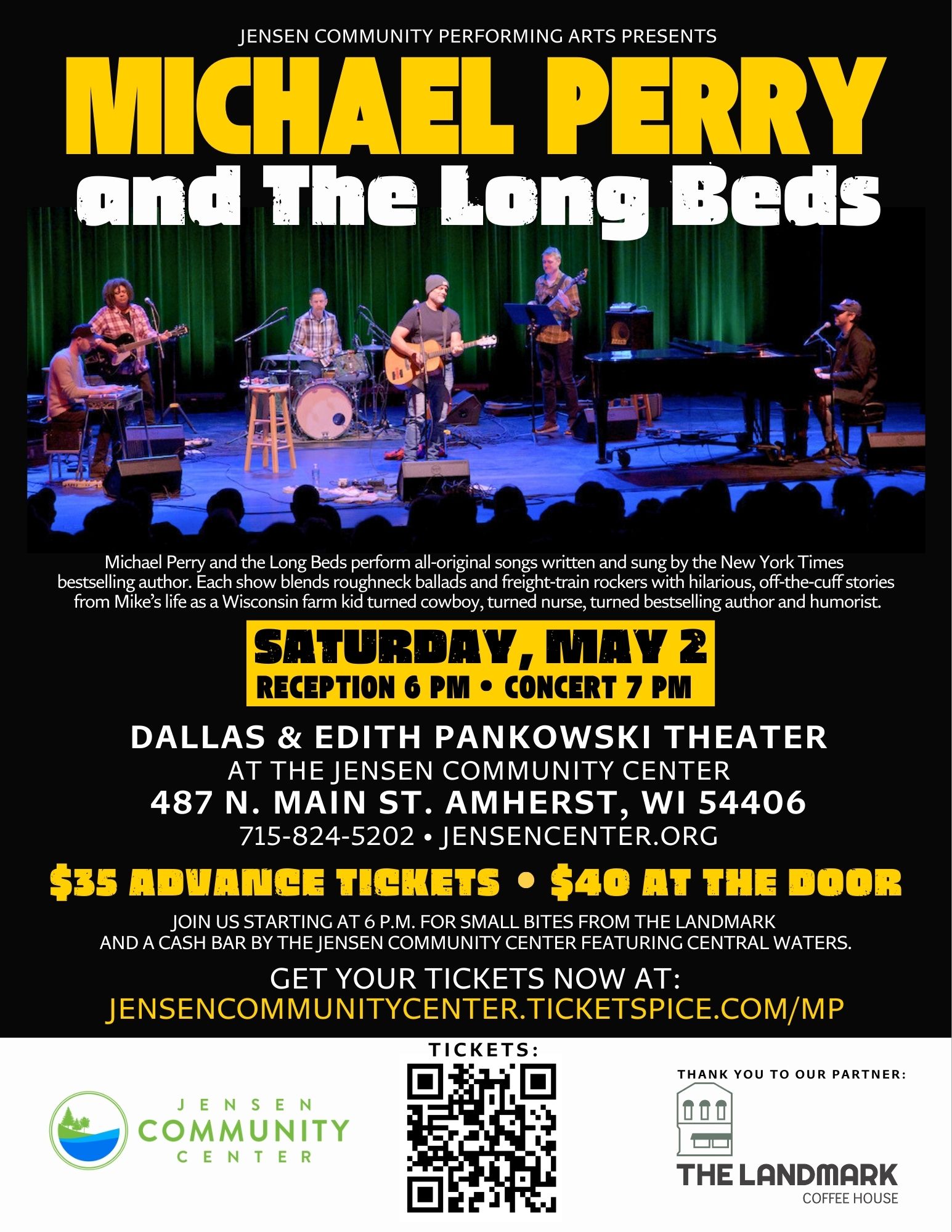 Michael Perry and The Long Beds are back! Come join us and be entertained by the New York Times bestselling author! Doors open at 6 with small bites from The Landmark and concert starting at 7 p.m. $35 advance tickets, $40 at the door. Get your tickets at https://jensencommunitycenter.ticketspice.com/mp