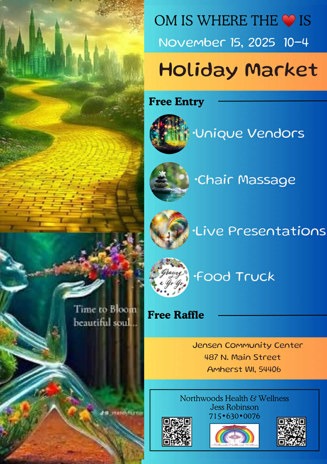 OM Is Where the Heart Is Holiday Market on November 15, 2025 from 10 a.m. until 4 p.m. Shop unique vendors, get a chair massage, check out amazing live demonstrations and movement workshops! Come hungry Grazing A Go Go food truck will be here. Bring a yoga mat, blanket, and an open mind to nourish your body! Learn more at: https://northwoodshealthandwellness.org/